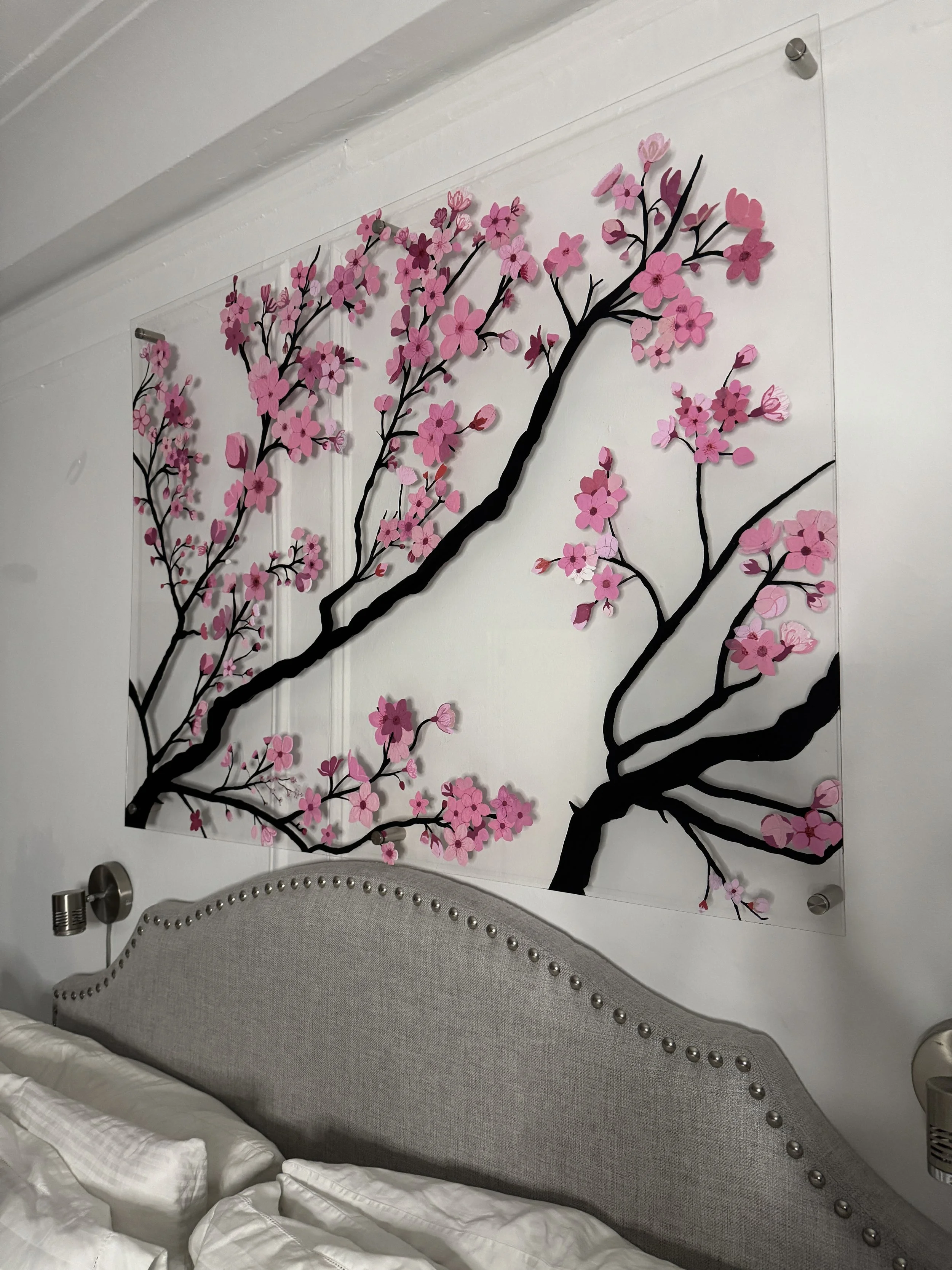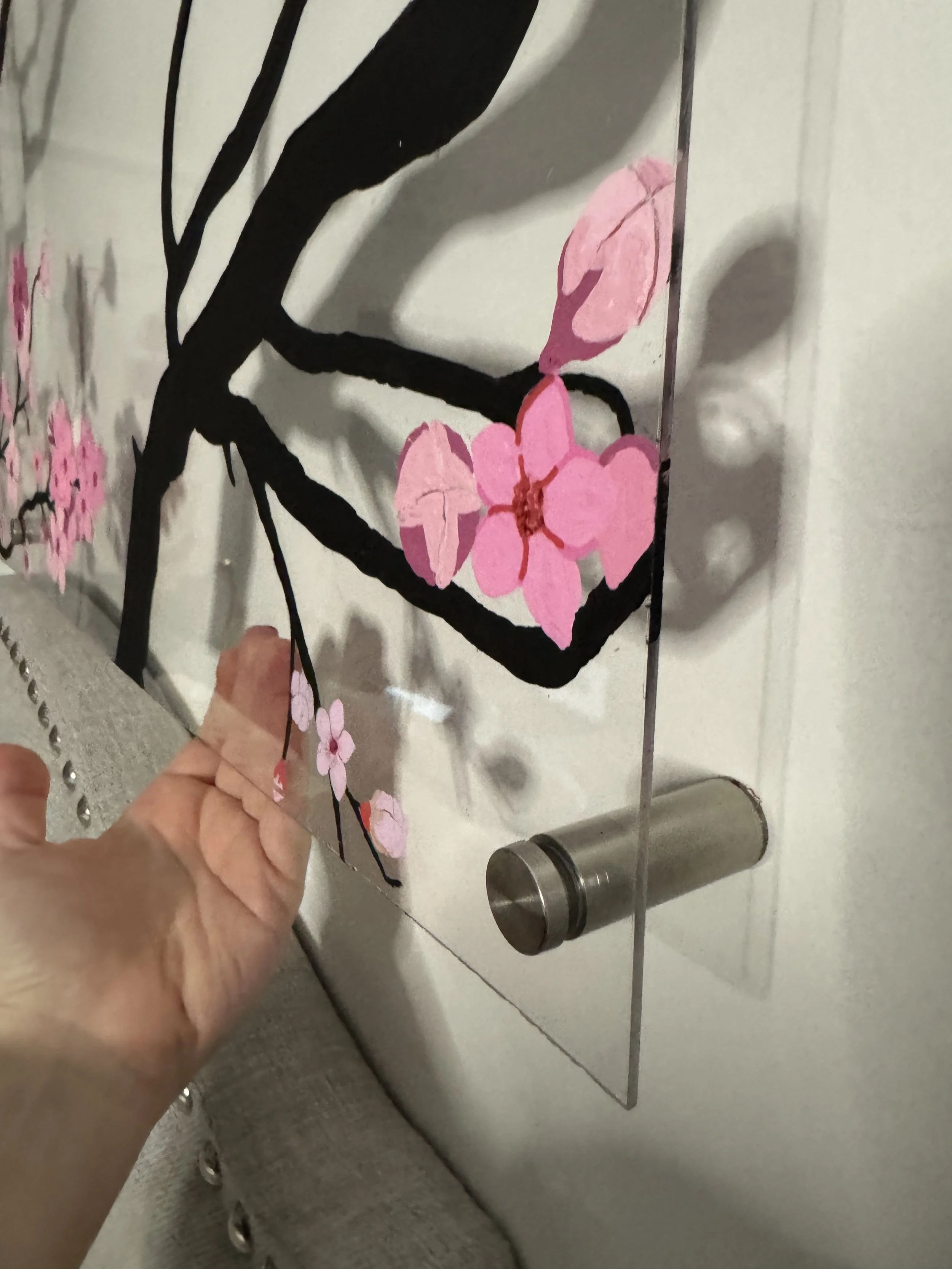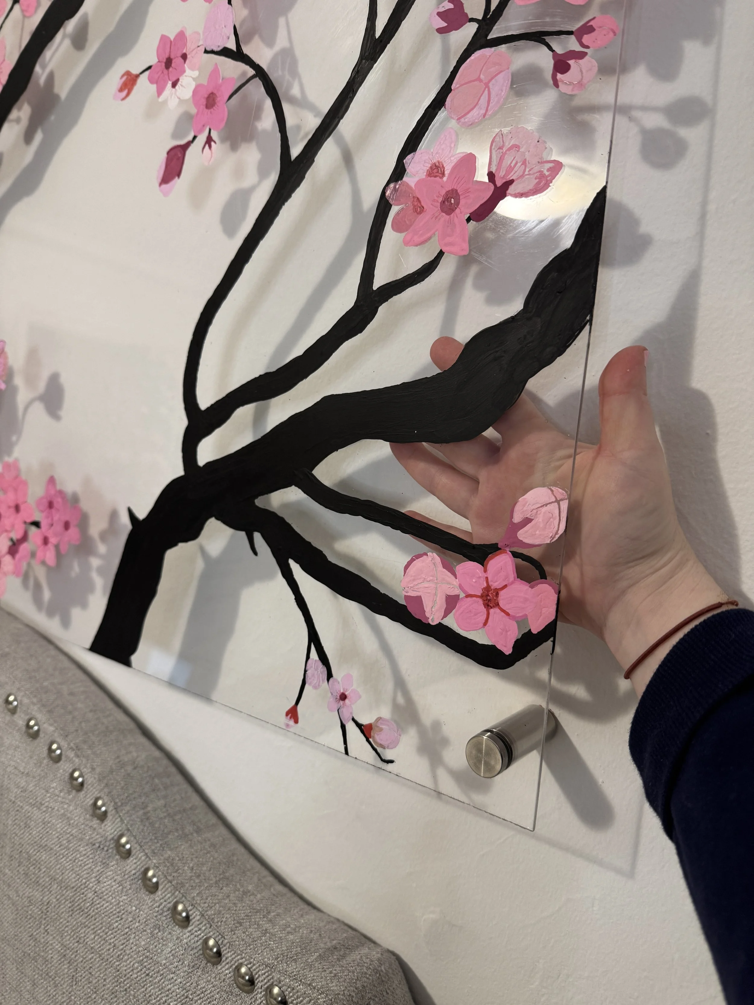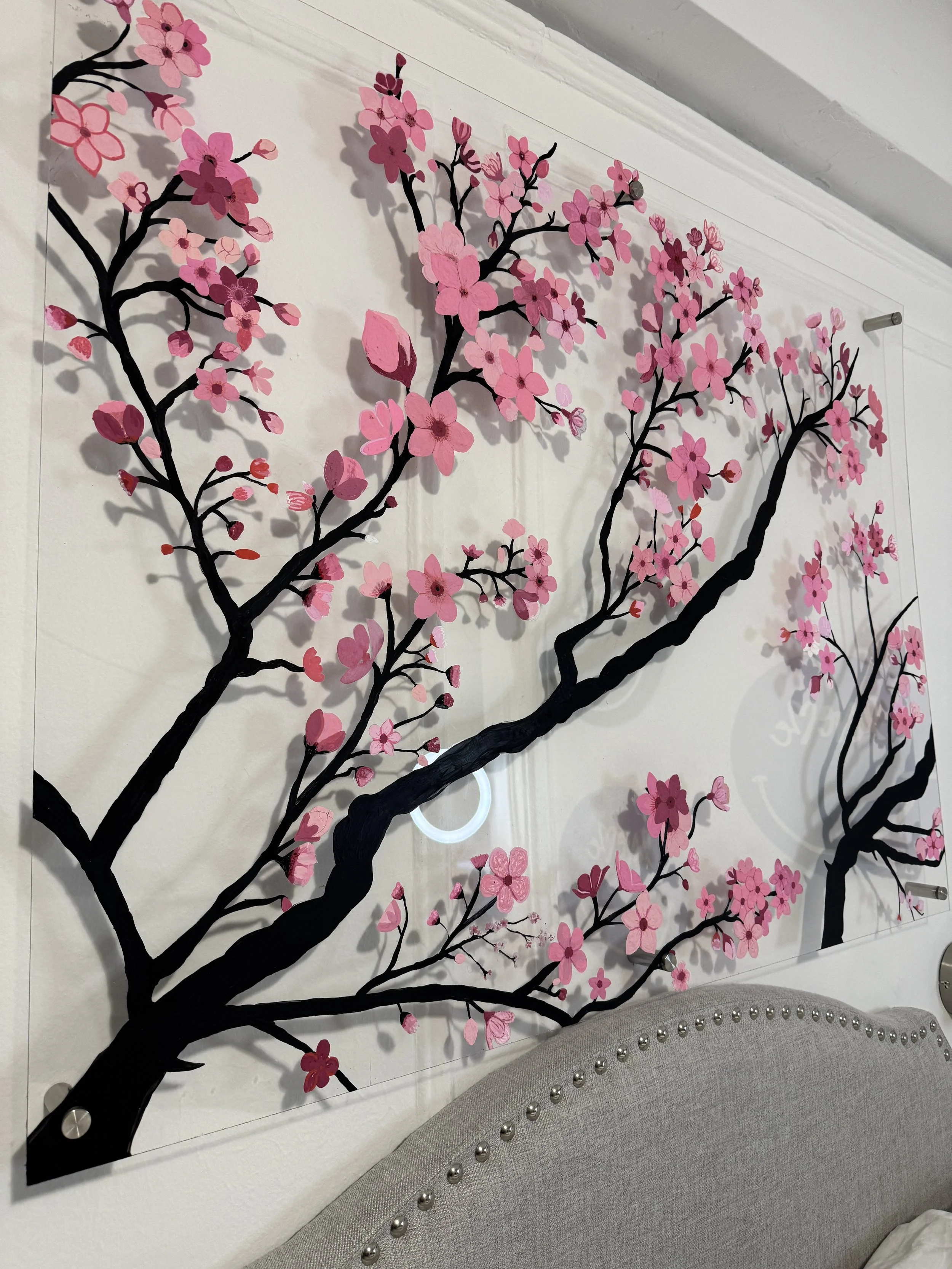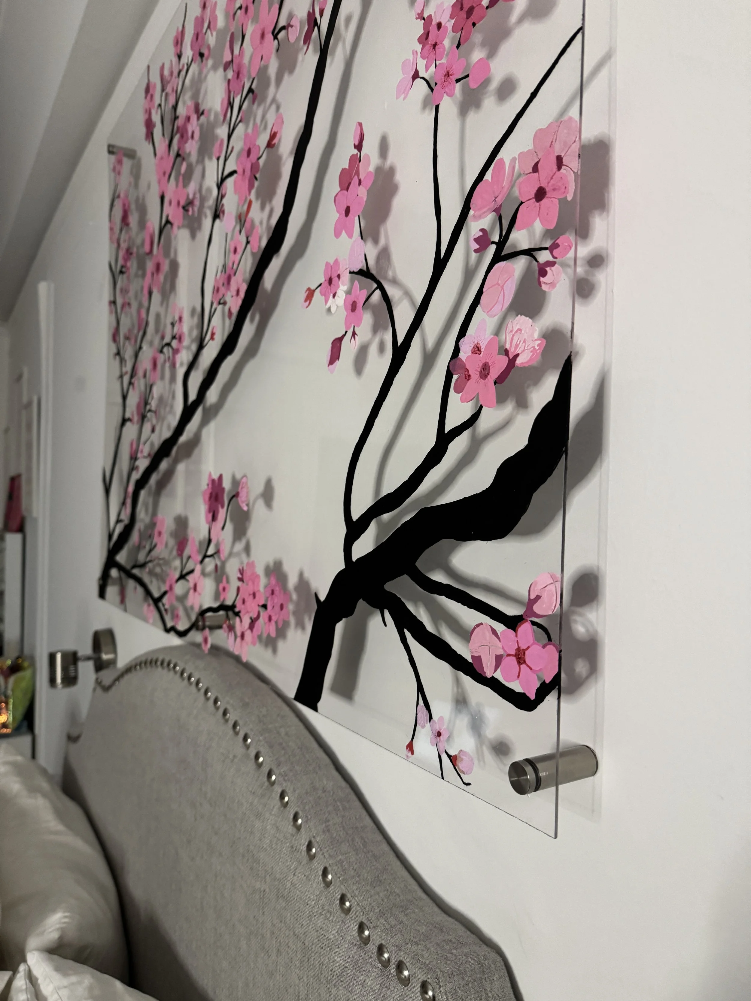 Each piece in this series is painted on an acrylic sheet, mounted with standoff mounts that elevate it 1.96 inches from the wall. This intentional distance allows the artwork to interact dynamically with its surroundings. When illuminated, the cherry blossoms cast soft silhouettes onto the wall, creating a three-dimensional effect that extends the presence of the piece beyond its physical form. Much like the reflections I observed on the water’s surface, the shadows bring a second layer of beauty—a reminder that what we see is often amplified and reimagined through light and perspective.