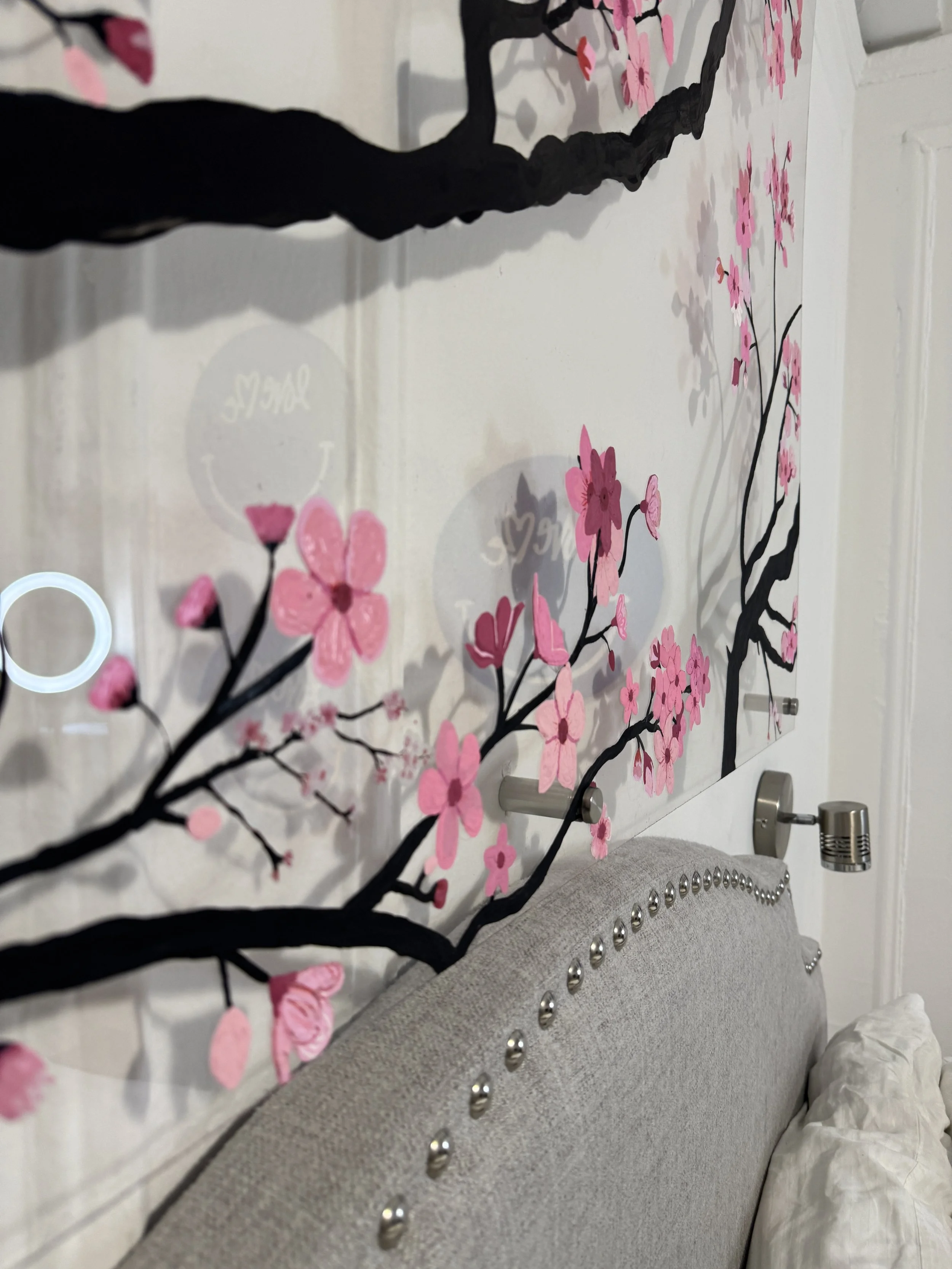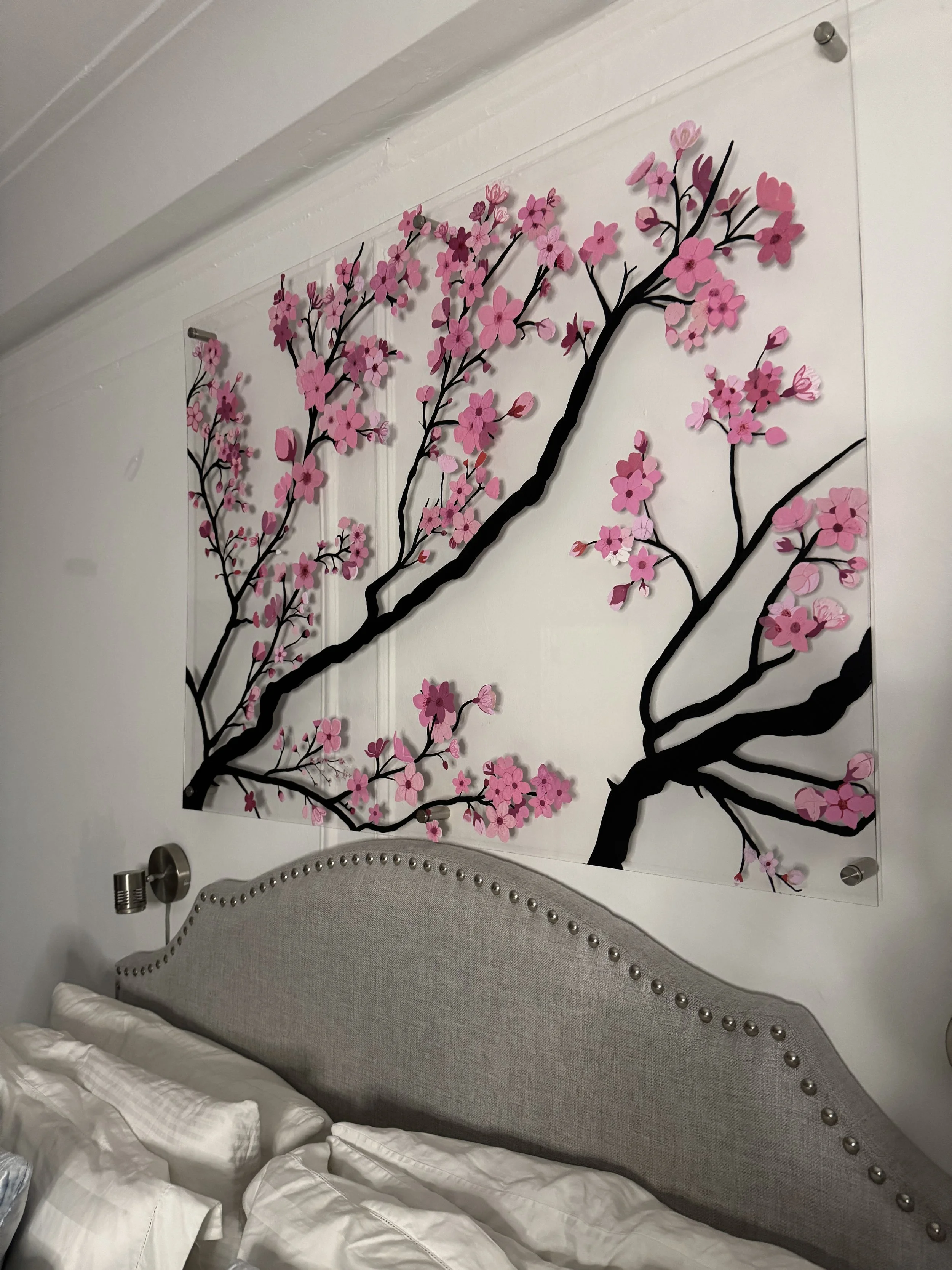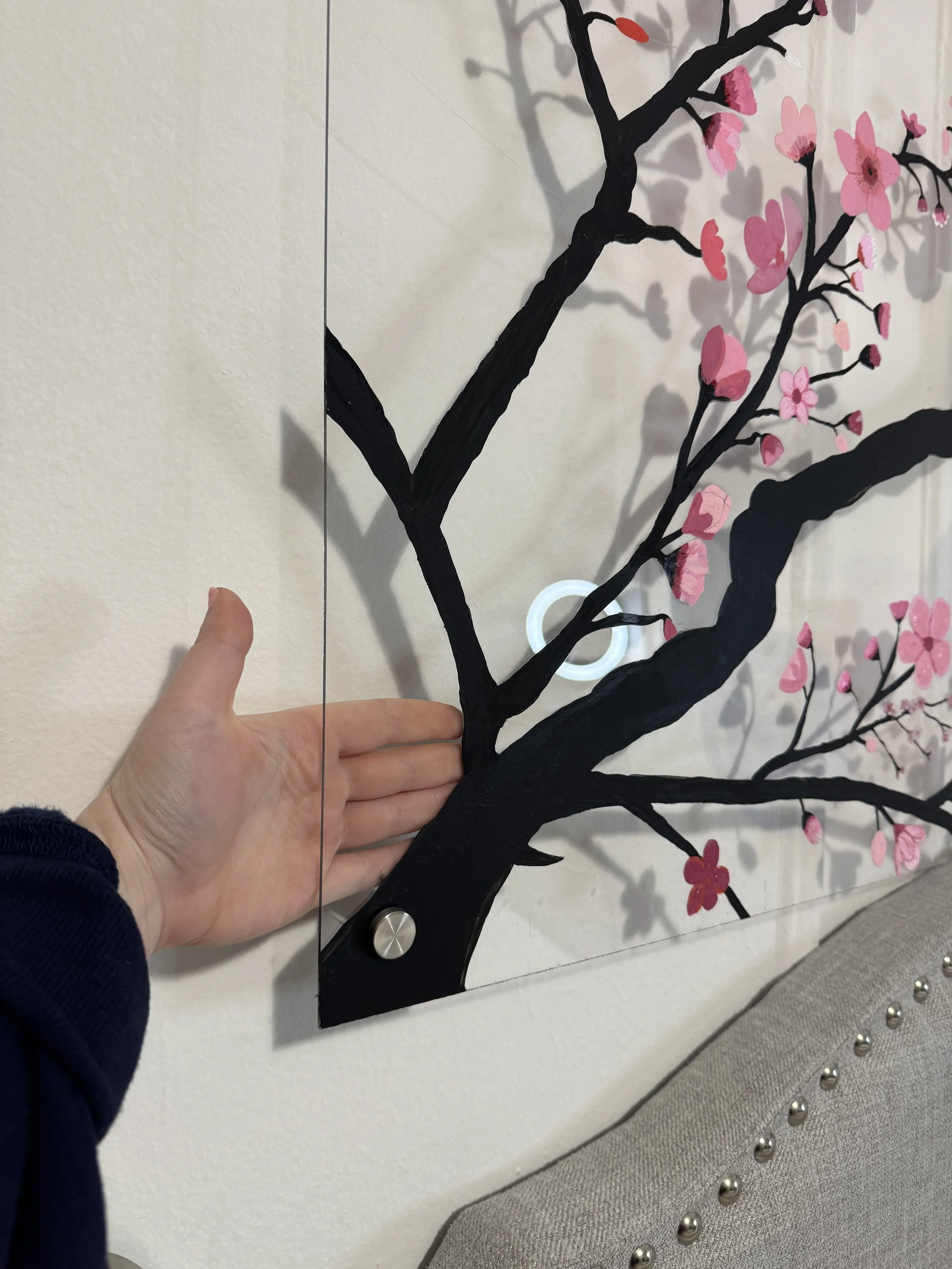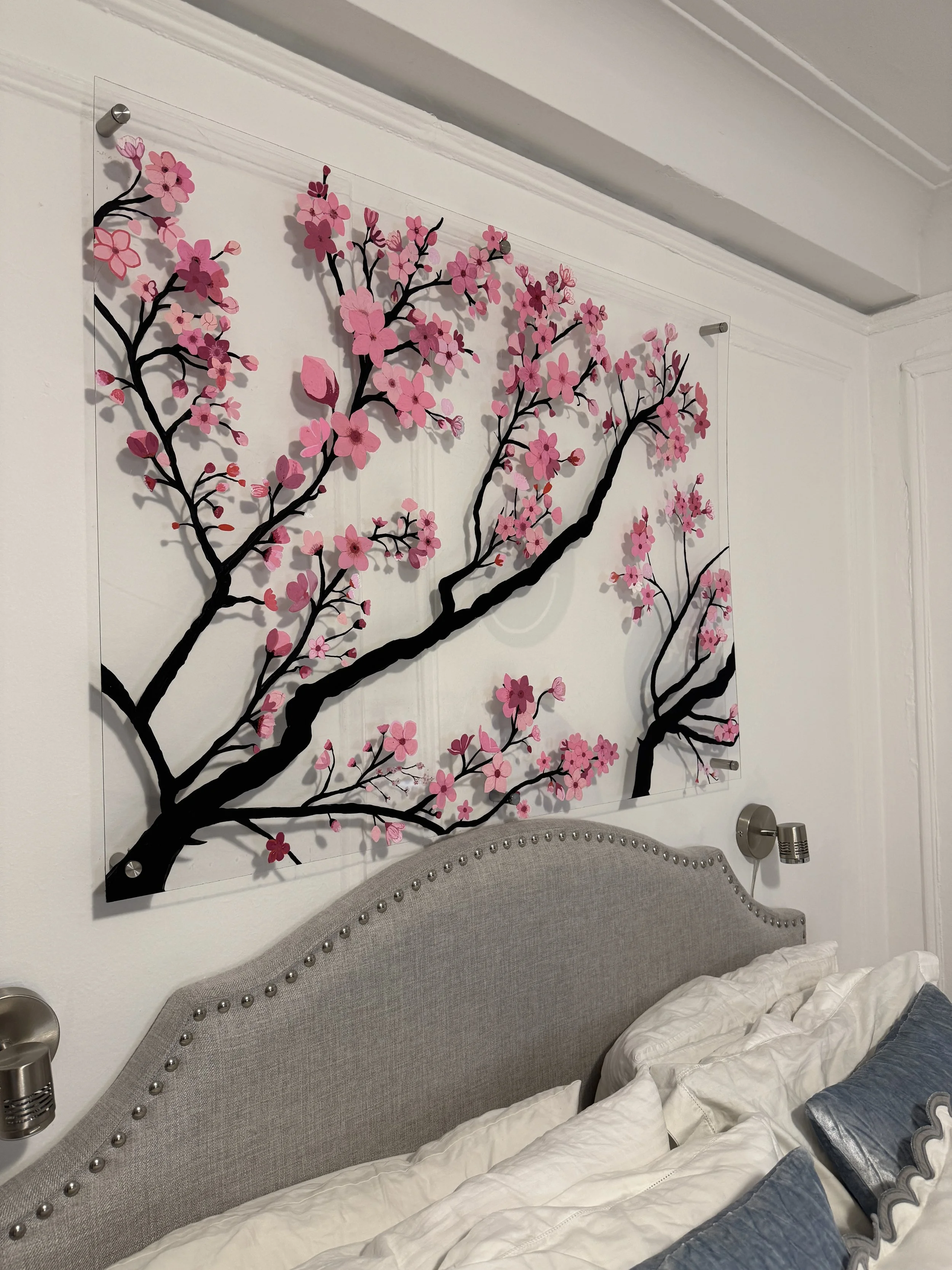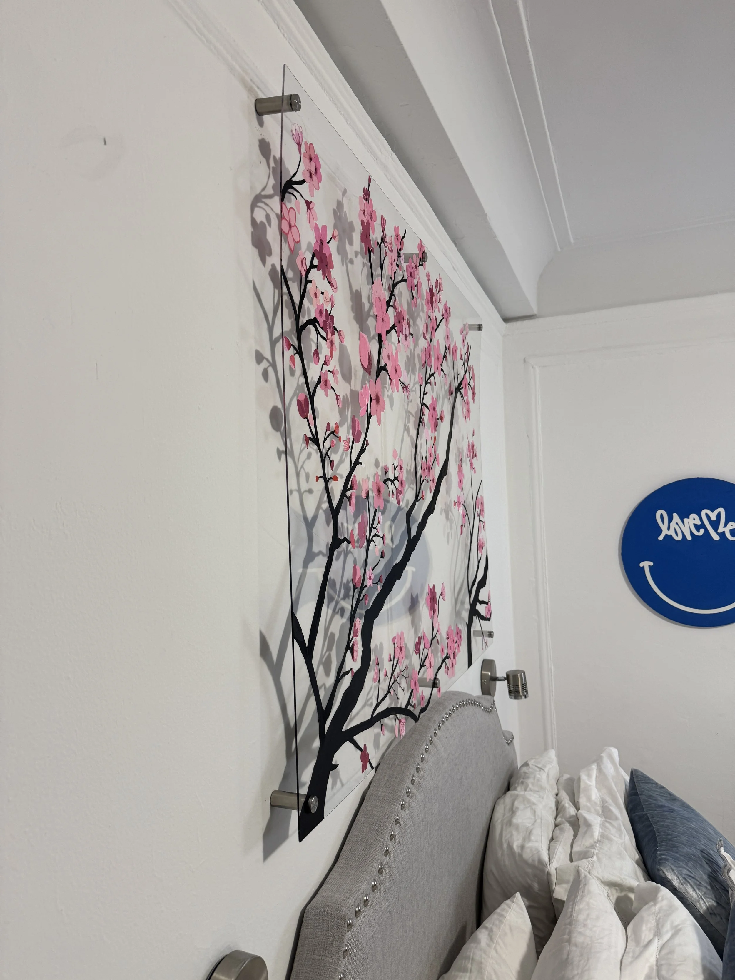 Each piece in this series is painted on an acrylic sheet, mounted with standoff mounts that elevate it 1.96 inches from the wall. This intentional distance allows the artwork to interact dynamically with its surroundings. When illuminated, the cherry blossoms cast soft silhouettes onto the wall, creating a three-dimensional effect that extends the presence of the piece beyond its physical form. Much like the reflections I observed on the water’s surface, the shadows bring a second layer of beauty—a reminder that what we see is often amplified and reimagined through light and perspective.