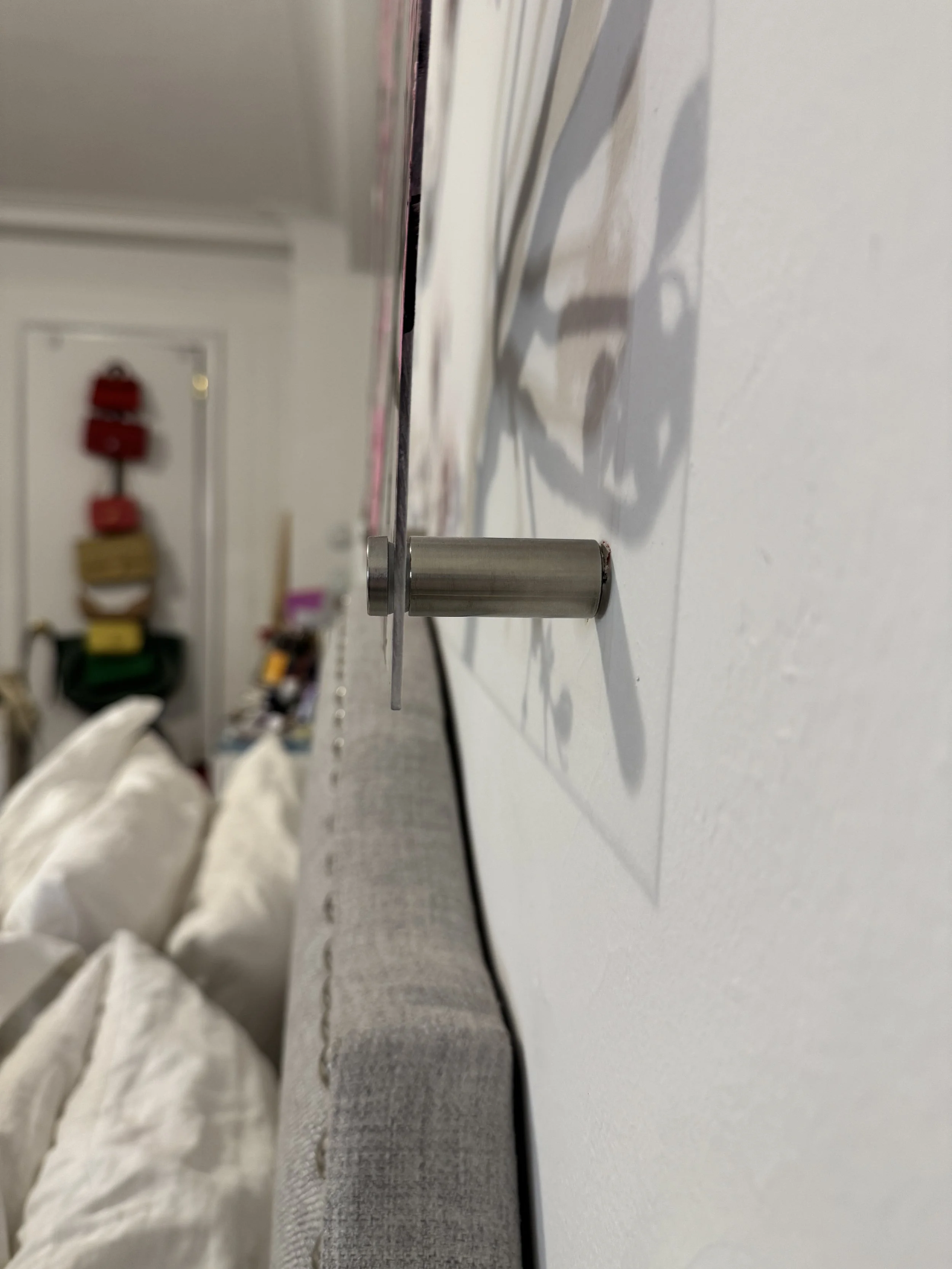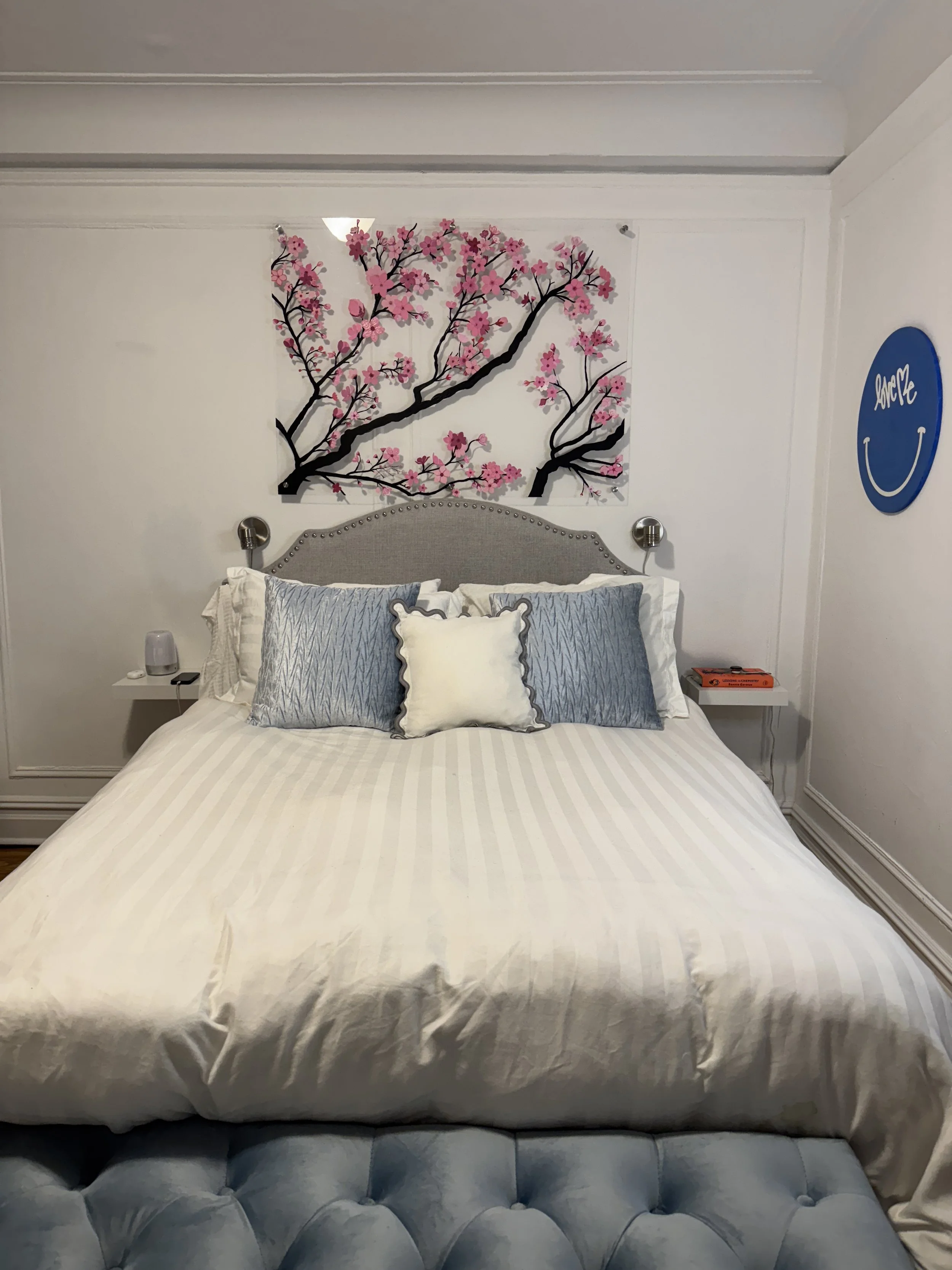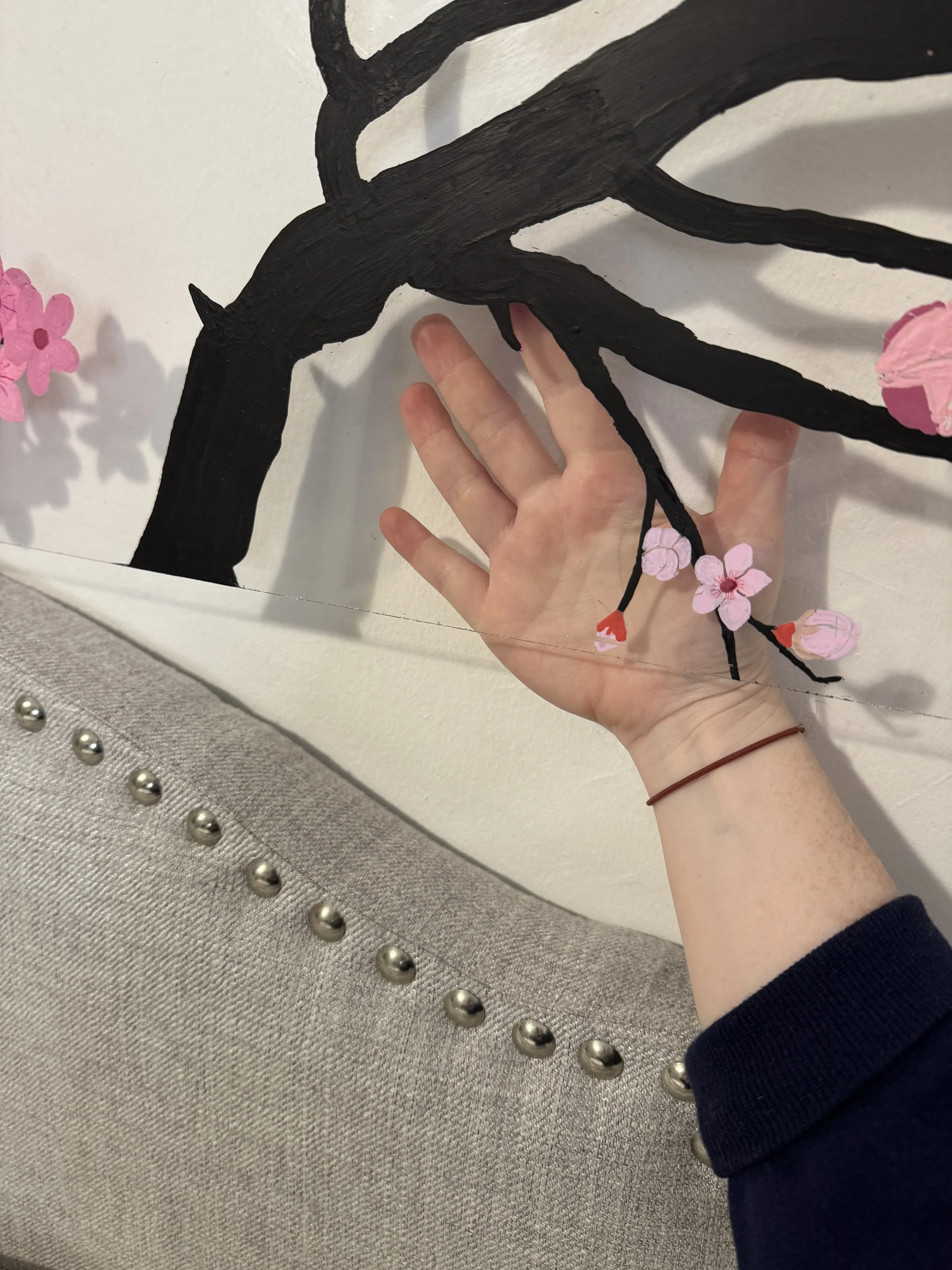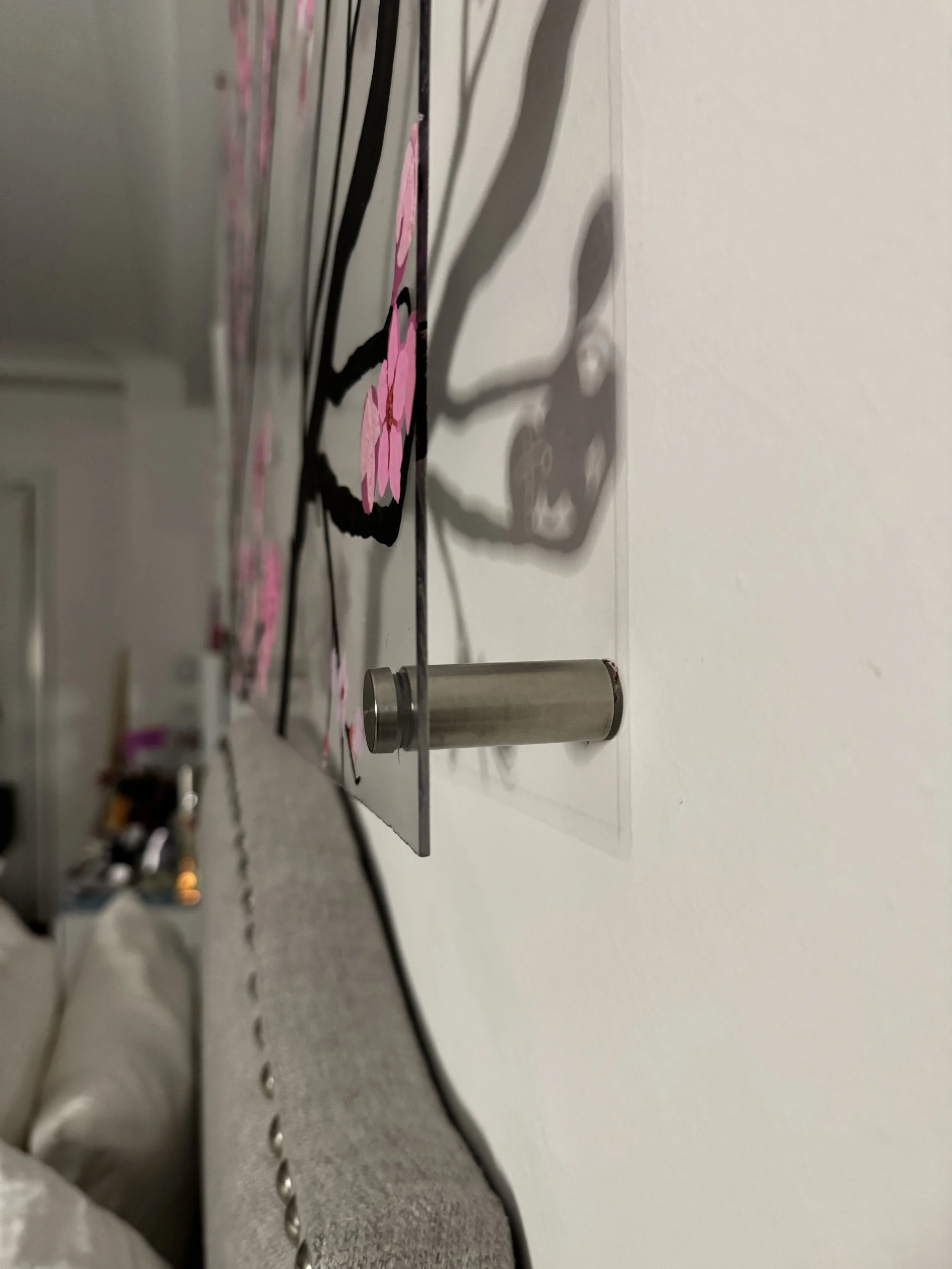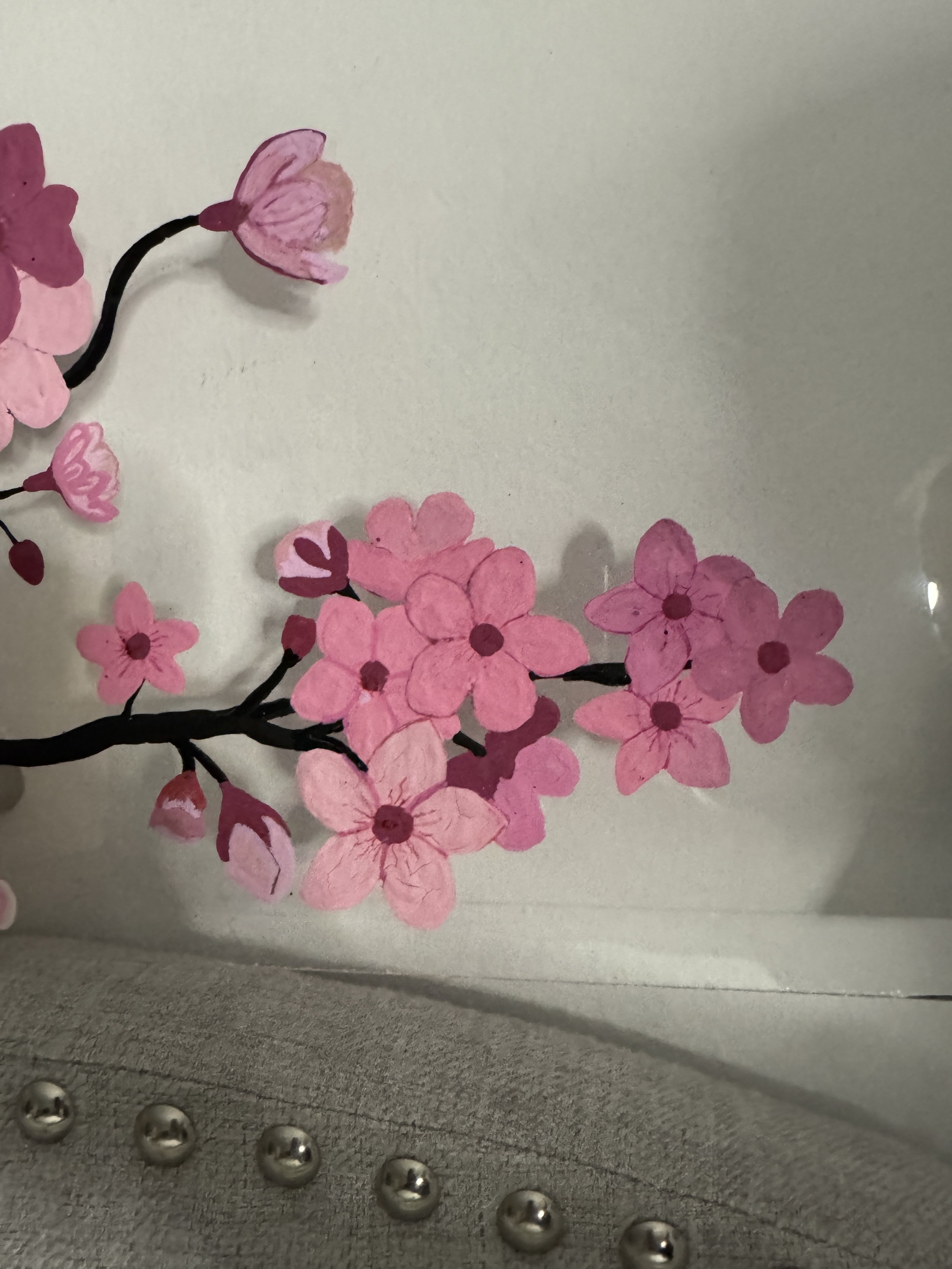 Each piece in this series is painted on an acrylic sheet, mounted with standoff mounts that elevate it 1.96 inches from the wall. This intentional distance allows the artwork to interact dynamically with its surroundings. When illuminated, the cherry blossoms cast soft silhouettes onto the wall, creating a three-dimensional effect that extends the presence of the piece beyond its physical form. Much like the reflections I observed on the water’s surface, the shadows bring a second layer of beauty—a reminder that what we see is often amplified and reimagined through light and perspective.